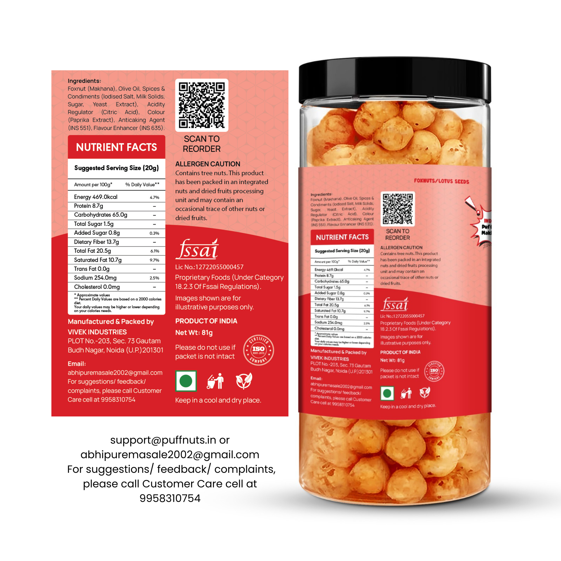 Puffnuts Roasted Flavoured Makhana offers the perfect balance of taste, crunch, and nutrition in every bite. Made from premium lotus seeds and lightly roasted in olive oil, these airy, puffed snacks are gluten-free, low in fat, and rich in protein, fiber, and calcium. Ideal for healthy snacking at home, work, or on the go, they’re a healthy choice for both kids and adults.